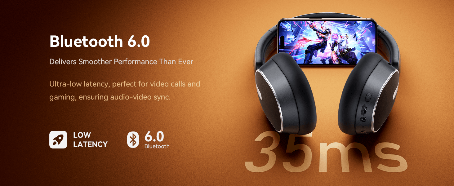Featuring next-generation Bluetooth 6.0 technology, these wireless over-ear headphones provide faster, more stable connections with improved energy efficiency. Multiple listening modes adapt to different scenarios: Music Mode enhances sound depth and clarity, while Game Mode reduces latency for more responsive audio during gaming and video playback.