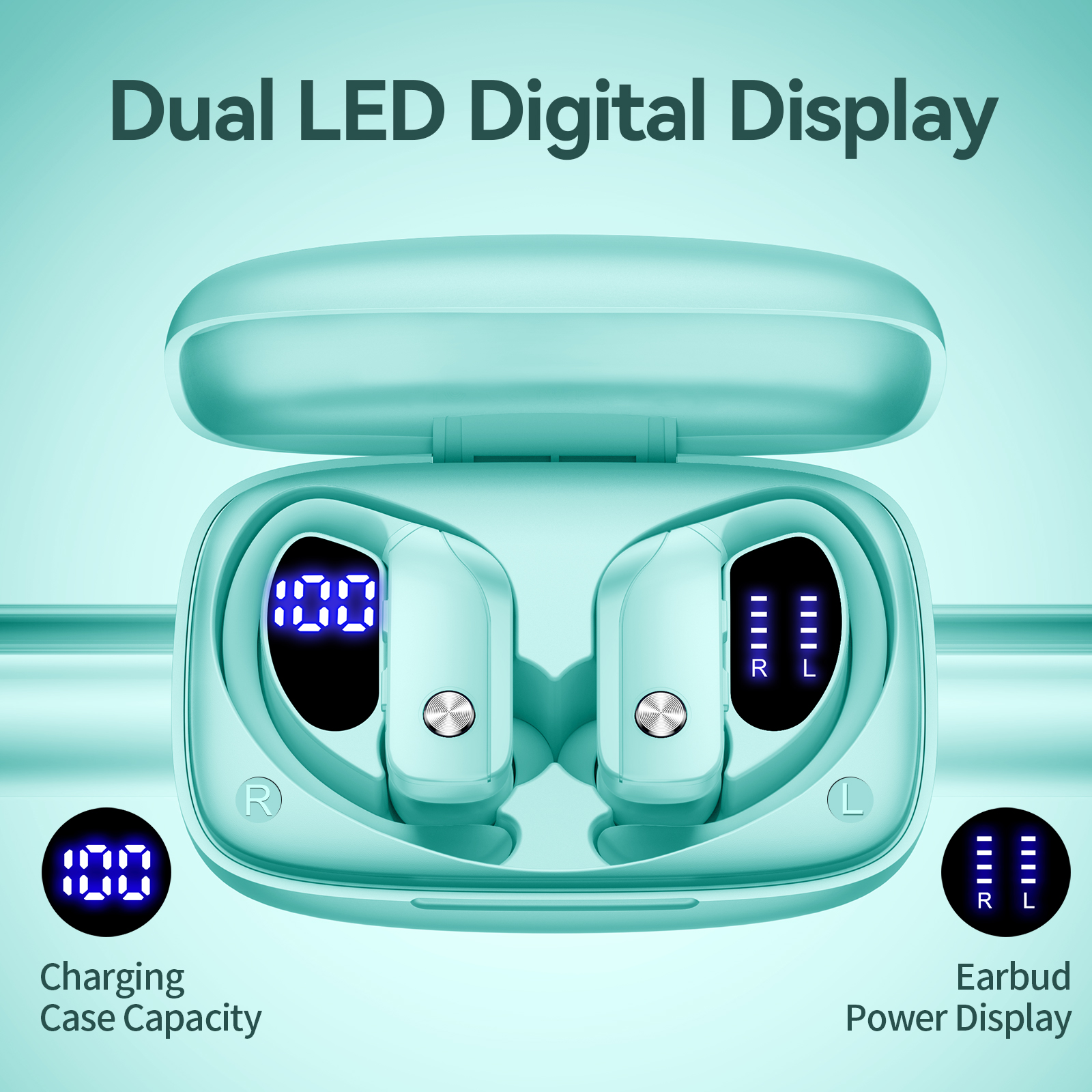bmani Ear Buds Wireless Earbuds Bluetooth Headphones with 80H Playtime LED Display Case, Over-Ear Hook with Mic, Stereo Sound, Easy Button Controls, Sports Earphones for Running Workout Gym Mint Green